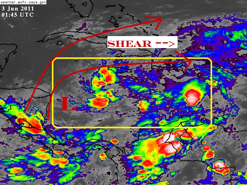 Overall conditions that favor cyclogenesis have gotten better over the last day or so, and will continue improve. There are a lot of little things that are inhibiting growth, mainly in the convection department. Vorticity, the spin in the atmosphere associated with cyclones, is strong and is strengthening with time. Mid and upper level shear is taking most of the convection off to the east and northeast towards the Greater Antilles. A weak and lopsided upper level anticyclone, which fans the top of healthy cyclones, is centered to the east of the surface low pressure system. This has opened up a small area of shearless atmosphere. If this anticyclone can grow and organize, the condition of the surface low will improve.