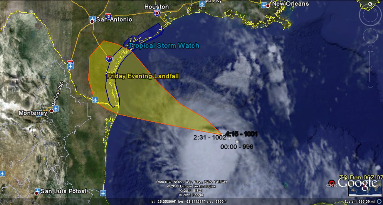 I expect Don to continue to intensify overnight with DMax and the very warm waters below. However, as we have seen over the last few days, Don is very fickle and could come down over night a little bit. Over the last hour or so I have noticed a dry slot developing on the northerly side, which may work into Don’s core. I do not think that there will be a total drop out of convection has there has been over the last couple of days. I think the landfall will happen as follows: