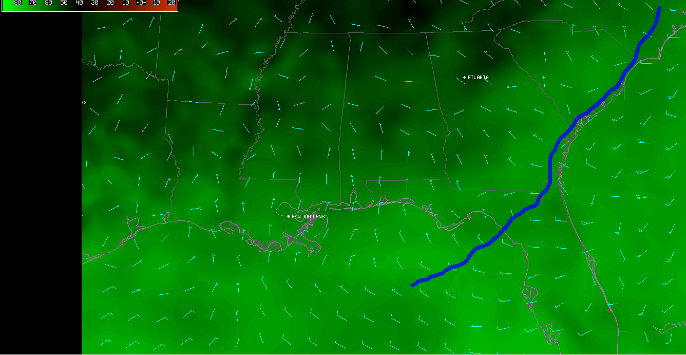 The ‘front’ is already pushing drier air into the southeastern US seen in black and darker greens in the image below, with dew points dropping into the 40s and 50s. The dew point is the most accurate measure of the amount of juice in the air, and the lower it is the drier it is outside. Dew points could drop into the 40s in north FL, and into the 50s across the I-4 corridor. This will limit shower activity around most of the state to less than 20% for the early parts of the weekend. This dry air will not stick around for long in May, and rain chances will be back up to 30-50% by early next week.