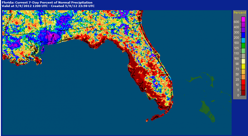 It has looked like summer across much of Florida this week, but that is all about to come to an end. I’ll get to that in a bit, but first I want to take a look at the pattern that we have been under for a little more than a week state wide. Interesting picture below showing the imbalance of rainfall over the last seven days. The image shows the percent of ‘normal’ rainfall over the last week with the warm colors showing less than normal and the cooler colors showing more rainfall than normal. This does not include today’s rainfall, but it does show that high pressure has been anchored down to our south and the beginning of the sea breeze in north Florida. Since high pressure remains in place to the south (through tonight), clockwise winds have been pushing storms in central and south Florida toward the east coast over the last week. In north Florida, the sea breeze has kept the severe weather away from the coast line. After the sea breeze pushes through an area, the area becomes too stable to support many showers and thunderstorms, and thus blocking any strong to severe weather from the coast line. You can see this effect in north Florida as the thin red line of below normal rainfall from Cedar Key to Apalachicola and almost to Pensacola Beach.