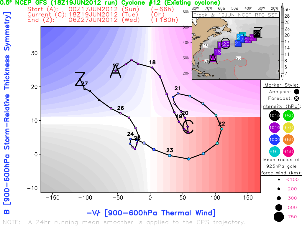 The 2012 Atlantic Hurricane season continues to crank out northern Atlantic named storms…today with the formation of Tropical Storm Chris. Over the last five days or so, a low pressure system moved away from the southeastern US as a weak frontal system. It passed north of Bermuda, and began to shed its frontal nature yesterday. Late yesterday, designated invest 95L looked like it was going to dissipate during this divorce. It slowly worked its way back and regrew a few thunderstorms and became more symmetric. This afternoon 95L became Tropical Storm Chris. Below is the 18z FSU Cyclone Phase Diagram that shows Chris’ history as well as a slow transition to a moderate, symmetric small warm core system. The National Hurricane Center shows some moderate intensification from 45 mph up to about 50 mph in about 48 hours. As of 11pm, Chris retains a pressure of 1005 mb. They expect Chris to transition to post-tropical before that peak in intensity occurs however. The Canadian Hurricane Centre may get in on the act late tomorrow with forecasts as Chris is expected to move to the north possibly toward Newfoundland over the weekend. I expect no landfall, but gusty winds and high waves are possible in maritime Canada over the weekend and early next week.