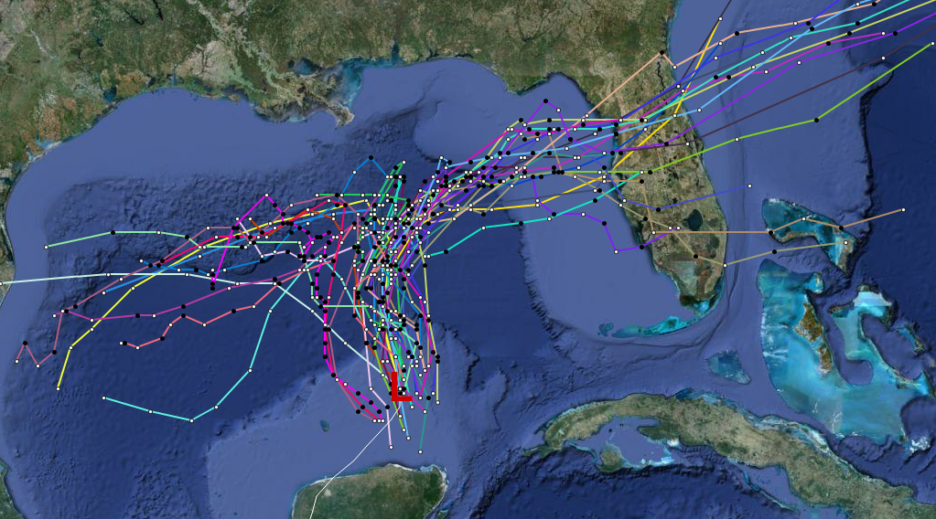 You have to look into the physics and dynamics of this system to really see why the NHC jumped from 70 to 80% this evening. 96L slowly drifted away from the Yucatan this afternoon by only about 2 mph to the north according to the Navy. Intense, cold cloudtops waned this afternoon over the Yucatan channel. This is to be expected with a developing system, and thunderstorms should reboot during the overnight hours tonight. An interesting thing that the downtick of thunderstorms allowed us to do was see the lower levels of the system. Below I have included my general estimates of the center of the system at two different levels. As you can see, these two are not lined up, and I have noted a couple instances of that low level center racing out in numerous directions today. I think that the ‘permanent’ LLC may take over farther to the east overnight nearest to where the strongest storms took place earlier today. The green arrows signify continuing bands of moisture moving into Florida overnight, and the orange arrow signifies general direction of motion over night.