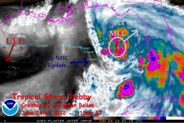 Enter central stage…Tropical Storm Debby. The hurricane hunters went out this afternoon into the central Gulf of Mexico and found a rather ragged system with multiple areas of rotation. As the satellite imagery shows below, the system is VERY ragged tonight with almost all of its convection to the east of the center. Between buoys, recon, and satellite, observations show a number of centers and low level swirls. The scatterometer imagery that has come in today has shown a stretched main circulation that is distorted from northeast to southwest. Trends tonight on IR have shown a number of circulations, at the lower and mid levels, relocating and dotting the area to the northeast of the dominant center.