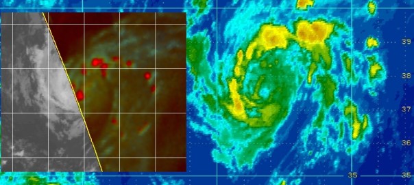 The following image shows the canopy structure of 98L as well as the underlying thunderstorms. Not that these images were taken three hours apart. In the left image, the bright reds indicate stronger thunderstorms. In the right image, the bright yellows and oranges indicate higher cloud tops.