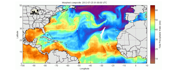 Bringing it back home, Florida will be experiencing an abnormally dry end of the week this due to the Saharan Air Layer, which is the same airmass that will plague the tropical wave mentioned above. SAL can be seen in the blues and greens in the image below protruding into the western Caribbean and the Florida Keys. This air will make it as far north as I-4 by Friday, which will drop rain chances to less than 20% and raise afternoon temperatures into the mid to upper 90s for the southern half of the state starting Thursday and beginning to end on Sunday. A southwesterly regime will set up with high pressure drifting to the south by Friday, which means morning showers at the beaches on the west coast and afternoon storms on the east coast. This dry air doesn’t necessarily lower the intensity of storms but it will certainly lower the number of storms that develop each day.