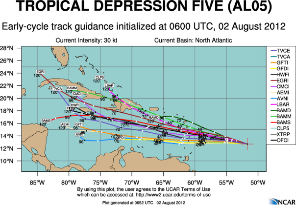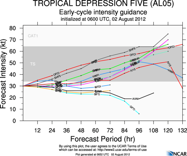 I’m not going to say much this morning, but I did want to include tonight’s early model runs for our new tropical depression as seen below. Note that the NHC (OFCI) is on the high side of the intensity charts: