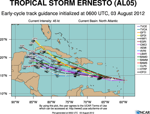 The forecast over the next 48 hours is fairly well certain. Ernesto will continue to track just north of west around the southern side of the Bermuda High for the next few days. Ernesto will enter the Caribbean Sea in about 4-6 hours and continue moving westward at 20-25 mph for 2-3 days. It’s on day four…or Monday…that things begin to fall apart…literally. Just about all of the computer models turn Ernesto to the WNW on Sunday when he will be south of Jamaica. At that point, Ernesto will ‘escape’ the flow of the Bermuda High and enter the lackluster flow of the western Caribbean and the Gulf of Mexico. We’ll talk about that forecast when we get there in a few days. For now I have attached the latest models below: