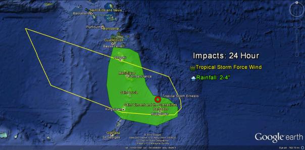 Hurricane hunters are on their way out to Ernesto at this hour with a second flight. During their first flight on Thursday, the hurricane hunters found winds of 50 mph and a closed center with a slightly faster forward motion. According to the 2am advisory and recent recon, Ernesto has maintained an intensity of 50 mph with a pressure of 1004 millibars. Forward motion at this hour is just north of due west at 23 mph. Ernesto is located 35 miles NNW of Barbados and will continue passing north of the island overnight. It will likely pass very near or just south of St. Lucia in a few hours. Tropical storm force winds are likely impacting Barbados at this hour and will be moving into the other islands including St. Lucia very soon. Winds will be gusty there for the next 12 hours with driving rains. Fortunately for Barbados, most of the thunderstorms will be north of the island, but St. Lucia and Martinique will suffer the strongest thunderstorms. Current watches and warning are as follows: