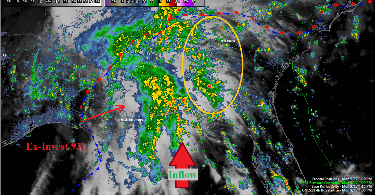 Anyone in the deep south today would tell you it’s been a murky, wet, and in many spots rainy Monday. But, what is causing the rather nasty weather today? All of the above is due to an early season clash of the subtropics and cool air from Canada. A mid-level spin developed yesterday in the far northwestern Gulf of Mexico ahead of a low level trough. The low was designated invest 93L for a short time, and very soon became non-tropical cold-core. This afternoon that same low pressure system has developed frontal features and very ample inflow from the south and east. The low pressure system is pulling in moisture from the Gulf, the Florida peninsula, and the far western Atlantic…in turn spreading storms far and wide across the southern third of the eastern sea board.