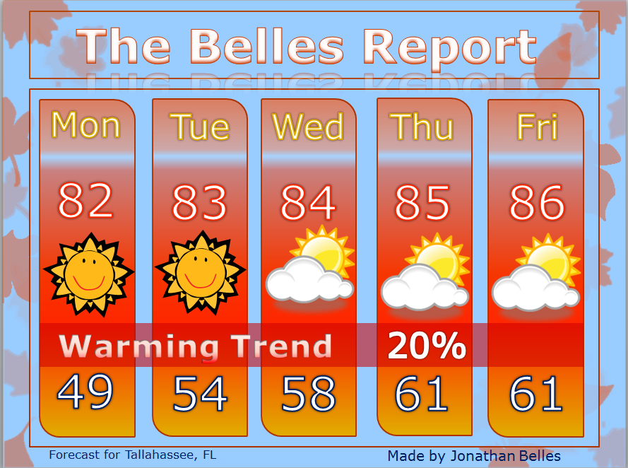Impact: What does that mean for your weather? Sunny skies all week long! But wait, you just said there was a tropical cyclone and a cold front coming! Well, you’d be half right. For 90% of Floridians, your weather will actually be better because of 99L. Whatever 99L may become, she will bring in northerly winds and drier air from Georgia and the Carolinas. As you’ll see below on my five-day for Tallahassee, highs will be warming up into the middle 80s and lows will return to above average. I put in a slight rain chance for Thursday because that is the one day that 99L will be close enough that it’s rain shield may push a few extra clouds and showers into the area. In no way should any of this weather cause you any distress, unless you booked a cruise to the Bahamas for late this week. And Miami might actually be able to witness a true hurricane instead of the tropical deflations my noles saw this past weekend down there. No, I really do not expect a hurricane to be anywhere near Miami, but I had to throw a jab in there somewhere.