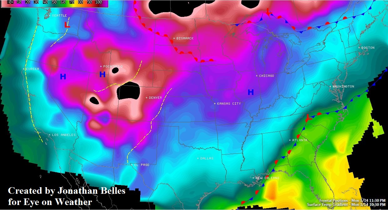 High pressure is finally releasing it’s grip on the southeastern United States, and the frontal boundary that has been draped from the Great Lakes to the southern plains is beginning to get a good enough shove to the east that it is moving again. All of the warm air in the lower 48 has been trapped into the southeastern 4: Florida, Georgia, North Carolina and South Carolina. Even that warm air will be shunted into the Caribbean by the end of the week. As pictorialized below, the cold front separates air that is in the 50s and 60s from air that is below freezing over the remainder of the southeast.