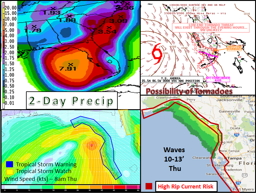 Wind – Winds will become gusty across the west coast of Florida and inland to I-75 tomorrow morning, with gusts to 40 mph in those areas. A TROPICAL STORM WARNING is in effect for the western coast of Florida from Charlotte County in SW Florida to St. George Island in Franklin County, FL. Areas in this warning can expect sustained winds to 40 mph, with the highest probability of tropical storm force winds occurring in the Big Bend. Winds of tropical storm strength will begin to reach the coast tomorrow afternoon. As Andrea passes over the southeast, winds are expected to increase on the Atlantic coasts of Florida, Georgia, and the Carolinas. For that reason, a Tropical Storm Watch has been issued from Flagler Beach, FL to Surf City, NC.