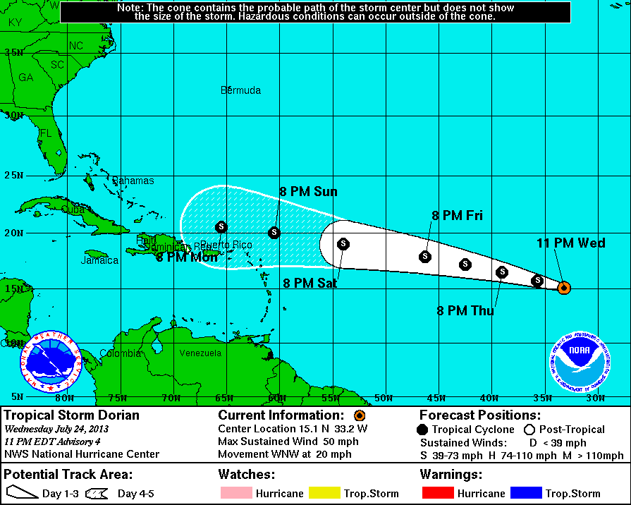 Climatology: Dorian is one of the farthest east forming tropical cyclones in the month of July, and may defy the odds in its future track. The NHC keeps this storm much farther south that all of the other storms that have formed in the eastern Atlantic, which may bring it closer to the land that most other storms. With the formation of this fourth storm, the 2013 Atlantic Hurricane Season is now climatologically ahead of schedule by one month. This is not an indicator of how the rest of the season will go, but just an interesting face.