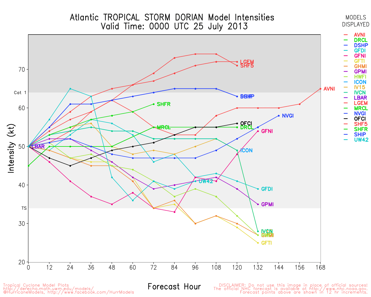 Track is the easy part of the forecast, with an emphasis on easy. See the current intensity models below: