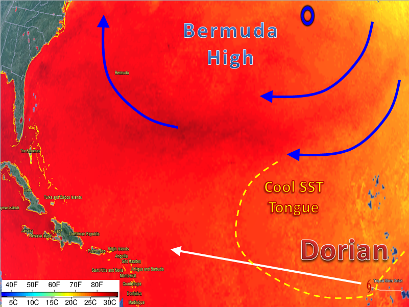 Dorian underwent a minor intensification stage last night, and has held a steady state this afternoon. Weaker tropical systems often intensify during the overnight hours since that is when the upper atmosphere cools the most. The difference between the cold, variable air aloft and the warm ocean below is what sustains systems and/or allows them to strengthen and organize. Thus, the colder the upper atmosphere, the bigger that difference. This afternoon, Dorian moved into slightly cooler water, an environment with low shear, and a relatively moist atmosphere.