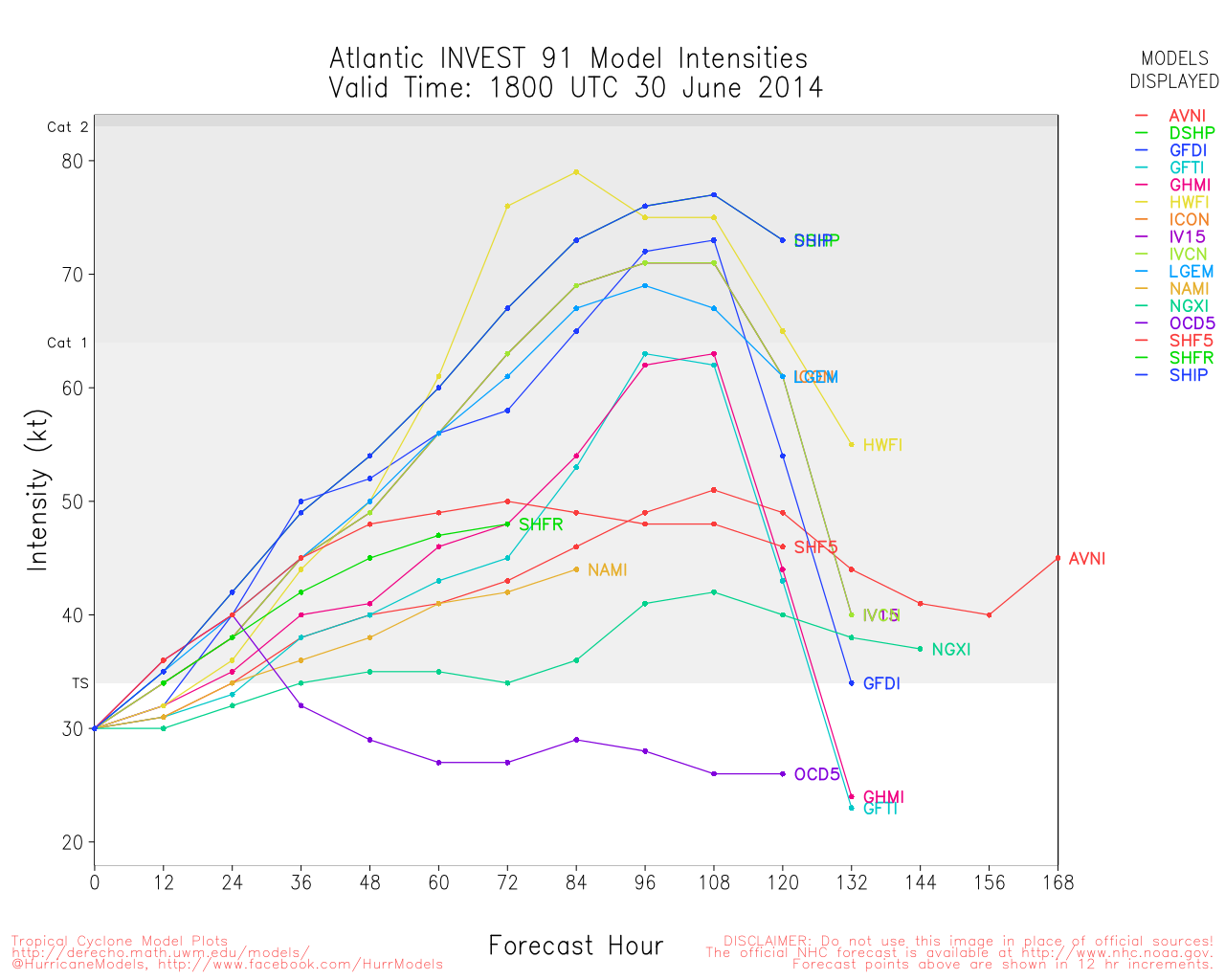 Dry air remains largely above 400 mb (upper levels) according to the models, that is largely the biggest battle this system has to defeat. According to the HWRF, this could be a problem all the way past the recurve and closer to the Carolinas. GFDL also shows the dry air in the northwestern quadrant. Shear also upticked a bit this afternoon, however this should weaken just a bit tomorrow. Conditions overall are expected to improve a small bit. Warm waters should prevail over these challenges, however they should limit any intense intensification. A moderate tropical storm is still in the cards with possible further strengthening. Something to notice in the below intensity models is that a number of good models now make 91L a hurricane in a few days. There is a possibility that a hurricane could be approaching North Carolina on July 4th.