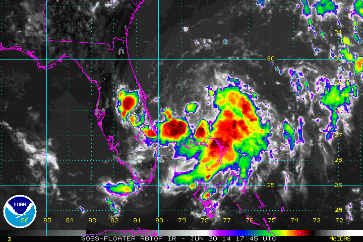 It should take roughly one more day (+/- 1 day) until the formation of a tropical cyclone – depression or storm named Arthur. 70-80% of the models running this evening brought this tropical low up to tropical storm strength within 24-30 hours. The data from this afternoon’s flight has not been added to most of the models yet, so that could change. We could almost expect diurnal conditions should provide a boost to convection, which may allow enough of an uptick in thunderstorm activity to allow it to be classified as a tropical depression or storm.