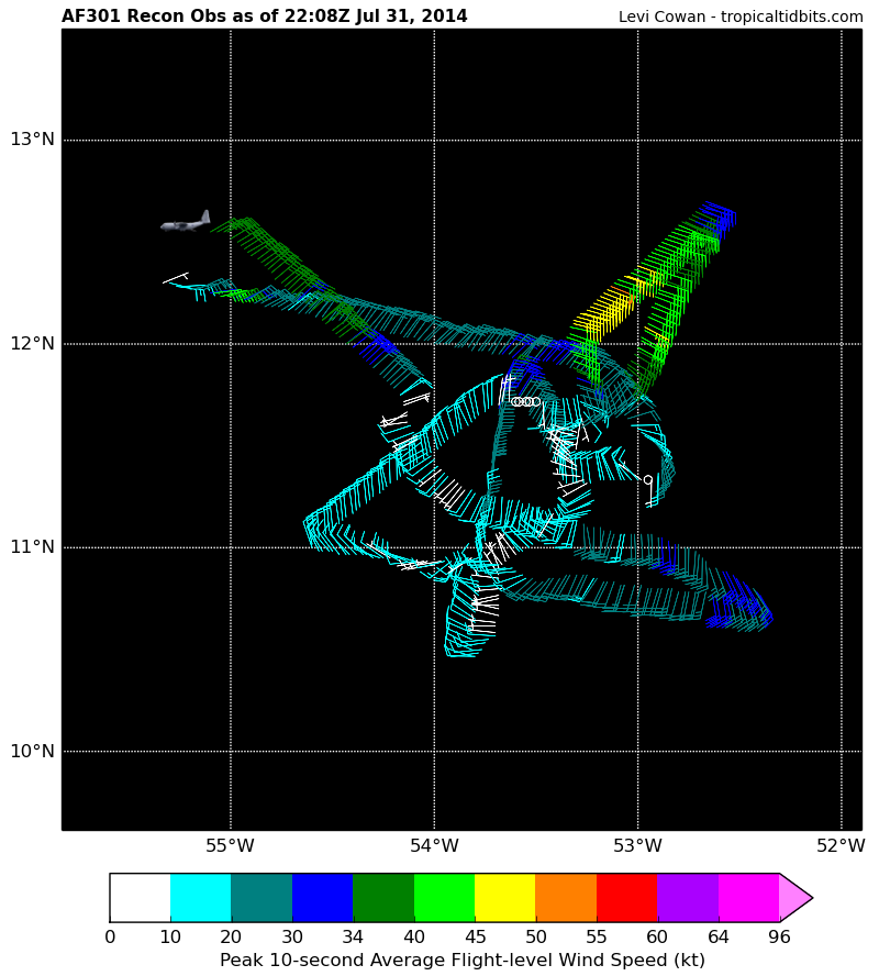 Notice where the highest winds are in 93L. Usually in a tropical cyclone you would see the highest winds in the front right quadrant, and that is what happened today with the highest winds on the northeast to northern side. BUT! Those winds may have not occurred due to 93L, and there is some suspicion that those winds are due to the wind burst that came from Africa with the drier air that has plagued. It is well known that winds that far north are faster. Even acknowledging that reasoning, winds have been estimated at around 40 kts or 45 mph.