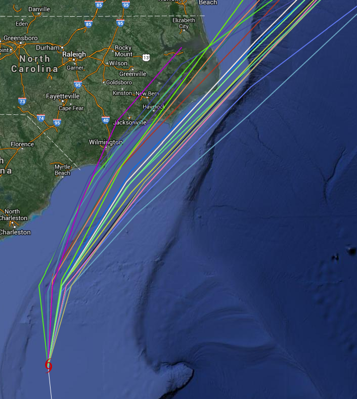 I must stress to you that you skip this section, go on to the next one and then come back to up to this one before reading into any of the lines of the next graphic. Each of those lines are a different model recently produced. These models have the data from the hurricane hunter flights this morning and early afternoon. Consolidation of the track models has been good thus far. Impacts will likely reach well into inland North Carolina and the mid-Atlantic on Thursday and into Friday. It is important to stress that the eye and eyewall may come very close to the barrier islands of North Carolina, impacts will be felt inland as well. Hurricane Warnings are in effect for much of the NC coastline, and an evacuation order has been put in place for Hatteras. My professional opinion is that this will make landfall on the barrier islands as it passes through unless rightward wobbles occur, but lately leftward wobbles have been more common. Models indicate that a good deal of this system’s effects will be felt on the left or westward side as it brushes New England on July 4th.