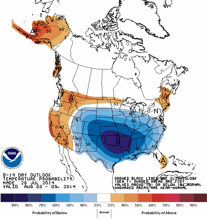 Probably not. Temperatures north of I-4 could drop a couple of degrees, and there is a subtle lowering in high temperatures toward the end of the week. The cool factor will come mostly from the drop in humidity. Confidence in this is in the low category due to the lack of the entire model suite at that time, the irregularity of the event, and the normal variability in cloud cover during the summer. Up to the north? Yes, this will drop temperatures for 2/3rds of the country!