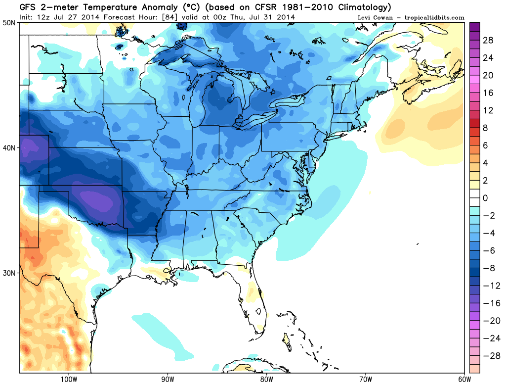 Temperature Anomalies from the GFS on Thursday Morning. In Celsius, but the take away from this is that blue/purple is cooler than average air.