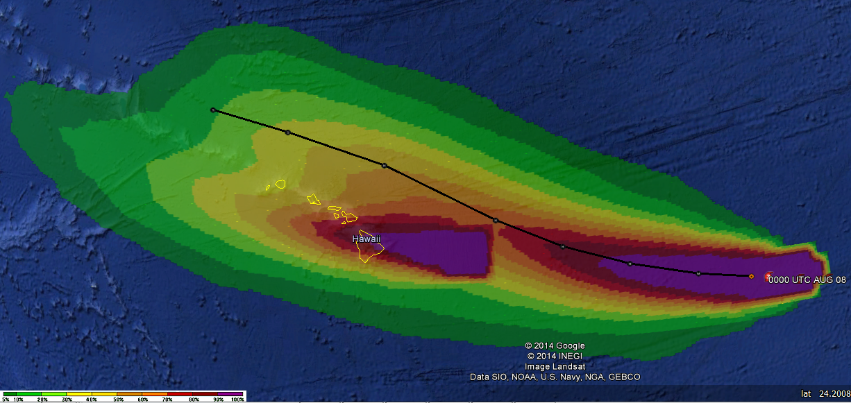 I absolutely hate to put a center line forecast on a graphic, however in this case it comes with an important story. Please note that the windward side of the Hawaiian islands will be different in Julio than it will be in Iselle. In Iselle, the windward (rainy) side of the islands is the north and eastern side of the islands. In Julio, as the center of that hurricane passes, the windward (rainy) side of the islands will be on the western and possibly southern side of the islands. This may catch people off guard if it comes to fruition. Obviously, if the track of Julio moves, that effect may change.