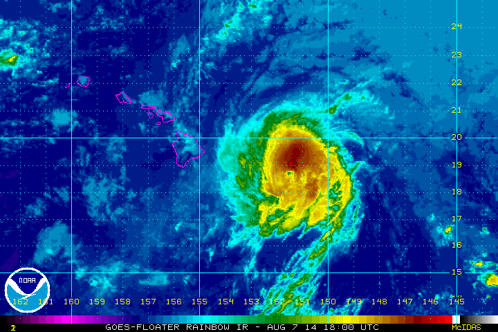 Hurricane Iselle is slowly moving toward the eastern shores of the Big Island in Hawaii. Iselle is now within radar range, but satellite loops and recon continue to tell the real tale of this hurricane. Radars seem to be going in and out as they get battered by heavy rain and near tropical storm force winds. Early during the afternoon (HST) a new burst of convection ignited over the northwestern semicircle, and soon after the hurricane hunters found hurricane force winds. Pressures during the last eye pass seemed to indicate subtle intensification, and the CPHC followed with a minor uptick in the winds to 80 mph. That burst of thunderstorm activity remains sustained however organization is wilting so the CPHC has lowered the winds again. This post will focus on Hurricane Iselle, but a look at Julio will be taken.