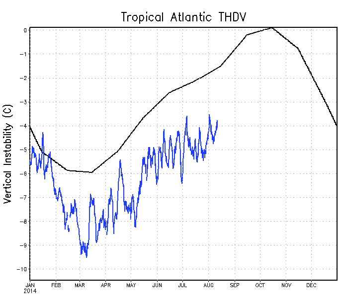 Pending the development of El Niño this fall, wind shear and atmospheric stability are expected to increase. Both of these things limit tropical cyclogenesis. Atmospheric instability is generally below normal in the tropical Atlantic, and has been all year. The east coast and subtropical Atlantic have been most supportive in terms of instability. Shear is the least as of late in the Gulf of Mexico and western Caribbean.