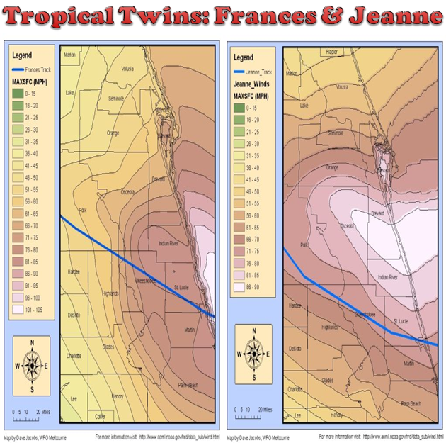 Frances and Jeanne were like those two sisters that are so alike that it is hard to tell them apart. In my recollection of them, I cannot tell them apart either. Jeanne was the extra dizzying or drunkard energy that swirled in the Atlantic and where it stopped we only found out at the end. Frances was more introspective and reserved, but it knew where it wanted to go. Their paths nearly coincided from the east coast all the way to the nature coast. By this point, I am sure that Polk County and the communities of Fort Meade, Homeland, Alturas, and Lake Baffum were thinking enough is enough. Charley, Frances, and Jeanne all passed through those areas in less than 45 days. Jeanne brought numerous impacts that Charley did not including moderate to heavy rain and stronger winds on the west coast of Florida.