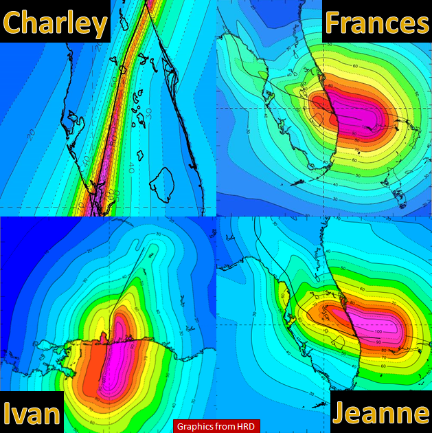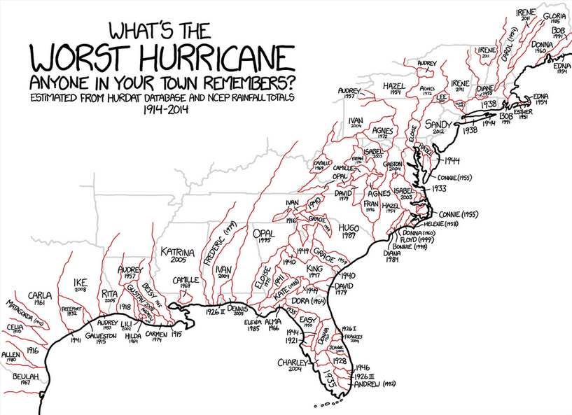 A cartoon from XKCD shows the most memorable hurricanes near the coast. All four of the Florida Hurricanes from 2004 are shown, and Ivan goes well inland: