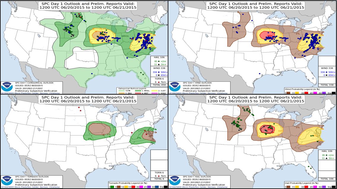 As Bill moved across the Mississippi River, it became truly just a rainmaker for most. It not only helped relieve drought in the southern Plains, whether they needed it or not, Bill also helped relieve drought in the southern Midwest. Bill had at least one more trick up its sleeve as it crossed the country. Along with the flood warnings that followed Bill to the east coast, there was enough energy in front of Bill to re-energize the characteristic stronger eastern semi-circle. Although not entirely due to Bill, the mid-Atlantic and mid-Appalachians saw more than 250 severe wind reports on June 20th into the morning of the 21st. These reports, below in verification of the SPC outlook, also saw a few reports of tornadoes and hail.