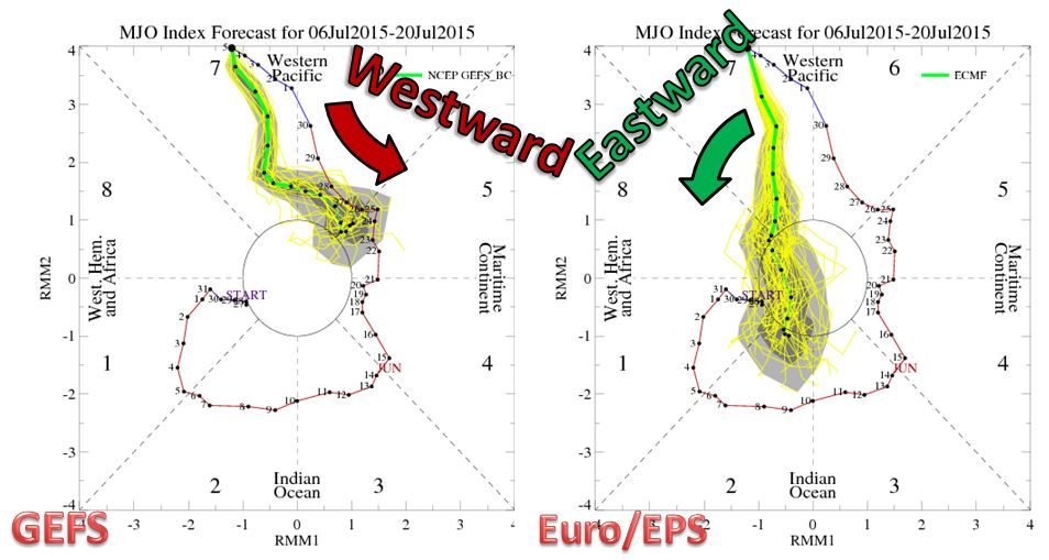 The long term wave signals that climatologist and meteorologists like to use for long term forecasts are very supportive for Pacific activity through this week, but fall flat as the signal is investigated farther east. Below are the Madden-Julian Oscillation from the GFS and Euro Ensembles. Note that the signals are opposite in propagation direction, but the end result is a nearly muted (within the center circle) for favorability in any basin. For the Atlantic we want to see the signal in the left side of the diagram. For Pacific cyclones, we want to see the signal in the upper part of the diagram. Note that the distance from the center of the diagram is a direct representation of the favorability of the MJO signal. Looking at the diagrams, they both show very favorable signals for the western Pacific. We have three tropical cyclones there now. If the GFS is correct, activity will be increased slightly toward Oceania closer to July 20th, but if the Euro ensembles are correct then the eastern Pacific may see a slight increase in activity next week. The Atlantic shouldn’t seek much of any help from this signal.