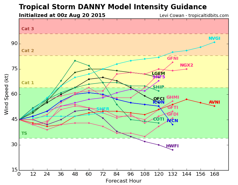 The overall thinking is that the weaker ridge to the north will allow Danny to slow down for the next day or so before faster trades accelerate Danny to the WNW. By the time Danny gets to 53-56°W, it should be accelerating, but it should also be feeling the effects of shear and drier air. This combination of environmental factors may keep Danny from becoming a hurricane or limit its time as a hurricane. Considerable uncertainty remains in the intensity of Danny.