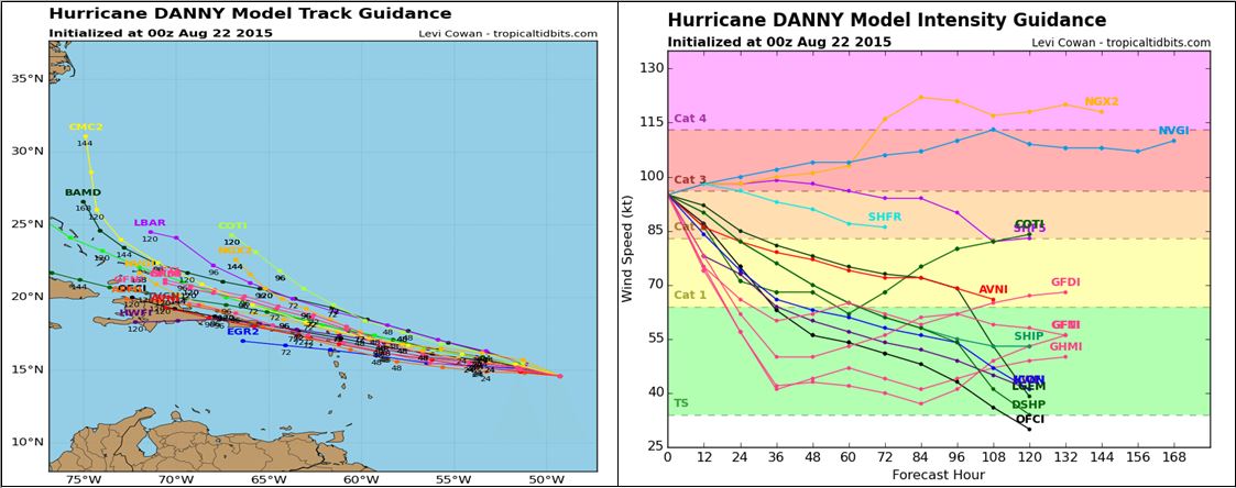 Without even bothering with the models that continue to miss the upcoming shear, the general trend over the next three days is for weakening with the exception of perhaps the overnight hours tonight. I cannot ignore the diurnal pulsations that Danny has undergone the last few nights with intensification phases. Danny is likely to either remain steady around the category 2/category 3 demarkation line or weaken just a bit before the roller coaster rides down as Danny crosses the shear. Based on recent satellite trends, choice “B” is the better option of the two. There are a couple of models that completely degenerate this system by Monday or Tuesday somewhere near the Virgin Islands or Puerto Rico. At this point I do not agree with that line of thinking, but I do agree with the NHC that a quick weakening may occur tomorrow. The global models continue to have a hard time seeing/resolving this small system. Shear on the other hand has no problem seeing Danny, and it is likely to take its toll. It is foreseeable that Danny could weaken to a tropical storm by sometime tomorrow night or Sunday morning…well before reaching the Caribbean.