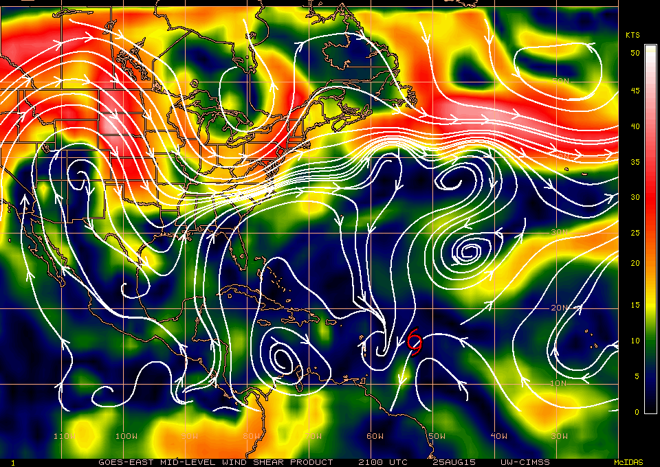 It became apparent this afternoon that Erika remains unstacked, even in the lowest 11,000 ft. Microwave imagery supports this with a low level center about a half degree north of the flight level -10kft- closed center for the P3 aircraft. If you look at the chart below and the full tropospheric vertical wind shear map, it becomes clear that the anticyclone (or upper level high pressure system) has become dislodged to the SW as noted by the clockwise spin in the streamlines. Those streamlines suggest a possible reason for the tilting down toward the south, although this is a wind shear and not a direct wind that would push a system off tilt. Gonzo did show some higher 500 mb winds on the western side. This could also explain the lack of a good outflow channel to the north. A slower movement at all layers may help organize and stack this system.