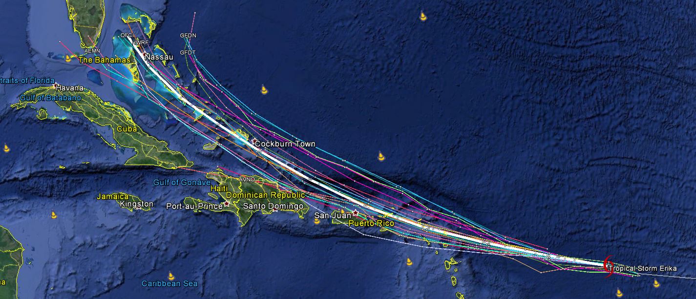Erika is likely to pass just north of Danny’s original path if it stays weak. This path could be slightly north of the islands with a stronger storm. This is essentially the same model game that we were playing with Danny a few days ago, but do not dwell on that. Every storm is different. History does not copy and paste its pages. Shear could temporarily add times of weakening over the next 24 hours, but as water temperatures warm in Erika’s trajectory, slow intensification is likely. Interesting to note that the 00z SHIPS models now suggest weakening for a time likely due to high shear. Tropical storm warnings are likely from Dominica to Saint Maarten with tropical storm watches expanding west from there.