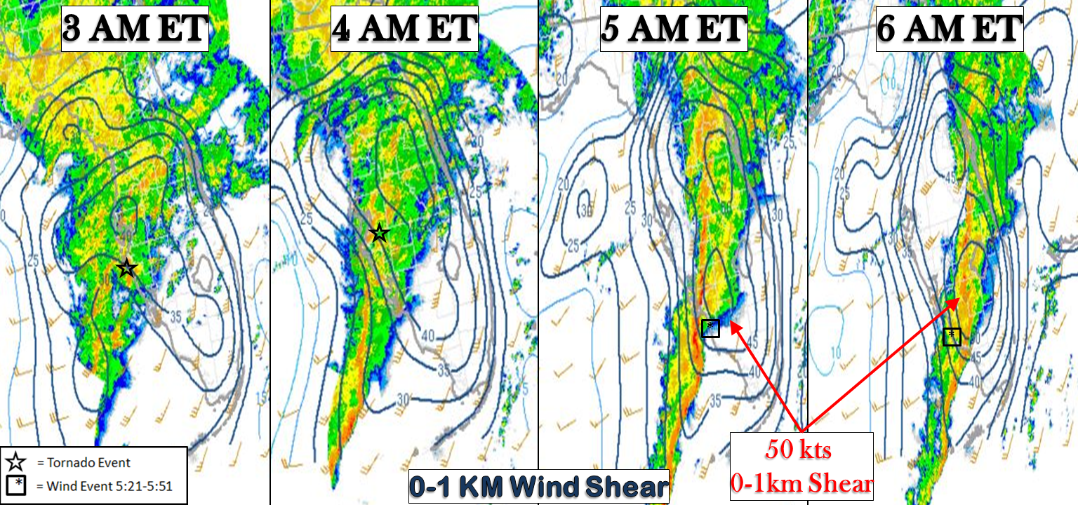 Wind Shear: I knew going into the event days before that wind shear was going to be well beyond supportive for severe weather. Wind shear in this sense is defined as the wind speed difference between the surface and 1 kilometer in altitude. I looked in the lowest 1 kilometer of the atmosphere, where 15-20 knots of wind shear is typically supportive of supercell tornadoes. Numbers on Sunday morning were 2-2.5x that value as the storms pushed inland.