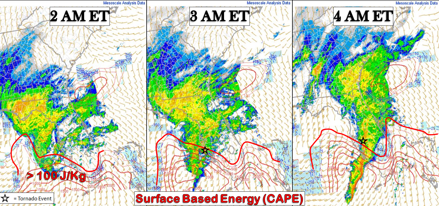 I have analyzed some of these ingredients below, but with the caveat that I note that the maps I used were SPC Mesoanalysis. These maps are known to have small errors since hourly weather balloons are not launched. These are small errors that do not largely affect my analysis. In all of the graphics, I have noted the tornado and high wind events with stars and boxes, respectively, on the panels closest to the hour that they occurred according to NWS reports.