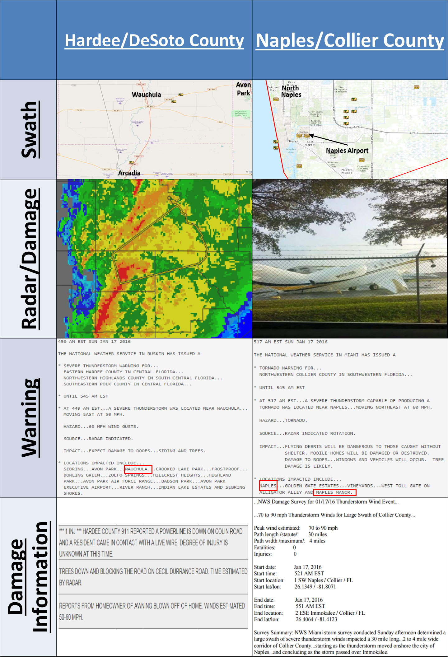 The Wind Damage: There were plenty of wind damage reports across the southern two-thirds of Florida as well. I have chosen to include Hardee/DeSoto counties and the Naples area in this post because these two areas had an injury and substantial damage. In particular, the Naples area got rather lucky even with a large swath of damage. Radar imagery showed an area off the coast that was suggestive of a waterspout, soon to be tornado. No tornado was confirmed, but extensive wind damage was found in Collier County. At Naples Airport, winds gusted similarly during this event and Hurricane Wilma in 2005 (84 vs 82 mph). At Naples Pier, winds were weaker in this event (60 mph vs 102 mph in Wilma). Five severe winds were recorded in the Naples area alone.