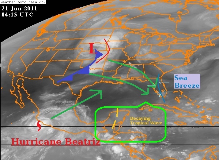 A dry day in Florida in the third week of June and the last day of Spring in an unwelcome sight to the parched soil in North Florida and smokey skies of Duval. Unfortunately, the only skies to see any water being wrenched out of the heavens may be in Alligator Country and the WPB/Miami metros on your Tuesday. The models are insisting that much of the Gulf Coast will see a large impulse of moisture through the first few days of Summer. The setup is a rather complex one, and the models are using three different sources of moisture to raise our rain chances to 40-60%. The first is the batch of Gulf Moisture that was in the western Caribbean during the last post. The tropical wave has since fallen apart, but its moisture remains with some added help from Hurricane Beatriz in the eastern Pacific. This moisture is poised to move to the north slowly.