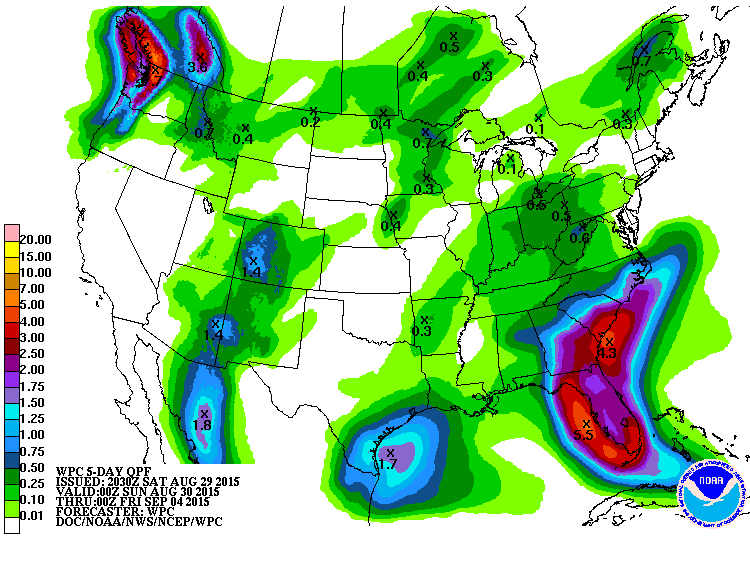 HEAVY, FLOODING RAINFALL is the biggest concern with Erika for Cuba and the Florida peninsula. For this reason, Governor Scott has declared a State of Emergency for the entire state of Florida. Satellite estimates continue to show diurnally driven rainfall for central and western Cuba totally a few inches. Portions of the Dominican Republic saw 6-9″ or 150-250 mm yesterday. Early rainfall estimates bring 3-6″ of rainfall to the Florida peninsula through the middle of the week. A flood watch begins Sunday morning and continues until later notice for the southern two-thirds of the Florida peninsula. There are still very soupy areas of the Nature Coast, SW Florida, and SE Florida from rains over the last two months. This additional rainfall could cause life threatening flash floods. Erika appears to be a multi-day event for Florida.