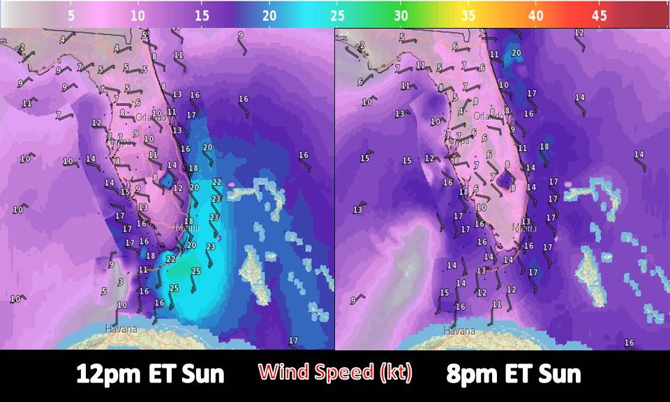Winds will be gusty at times to 35-40 mph tonight near and in central and western Cuba. Winds will be highest over the Florida Keys on Sunday and Monday where gusts could be as high as gale force and in the Gulf of Mexico through Tuesday. Seas will be heightened, and any trips into the waters may want to be reconsidered. Overnight and into tomorrow, seas will be up to 12 feet in the Florida Straights and 10 feet in the central Bahamas. Winds will be higher closer to the Florida coast and in the Gulf starting Monday. There is a brief chance of intensification on Monday in the very warm Gulf temperatures, but chances of any strengthening will be limited.